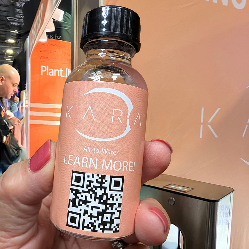 “Water is the most important substance on Earth,” read the Kara Water sign—more truth than slogan. Their device, called the Kara Pod, uses what’s known as Air-to-Water technology. It can produce 3.2 liters of crisp drinking water a day—enough water to brew up to 18 cups of coffee, with no plumbing required.